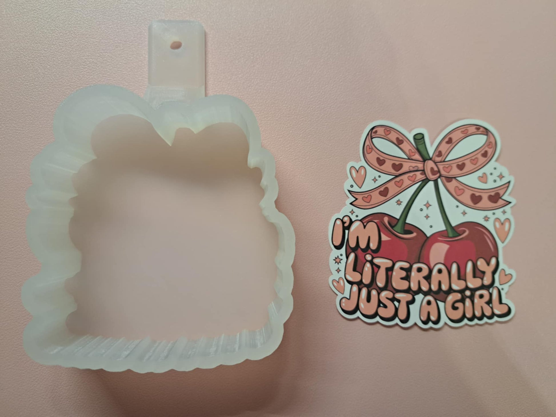 Literally Just a Girl Bow and Cherries Silicone car freshener mold is 1 inch deep and heat resistant up to 400°. Mold size interior is approximately 3.95 inches tall and 3.6 inches wide.