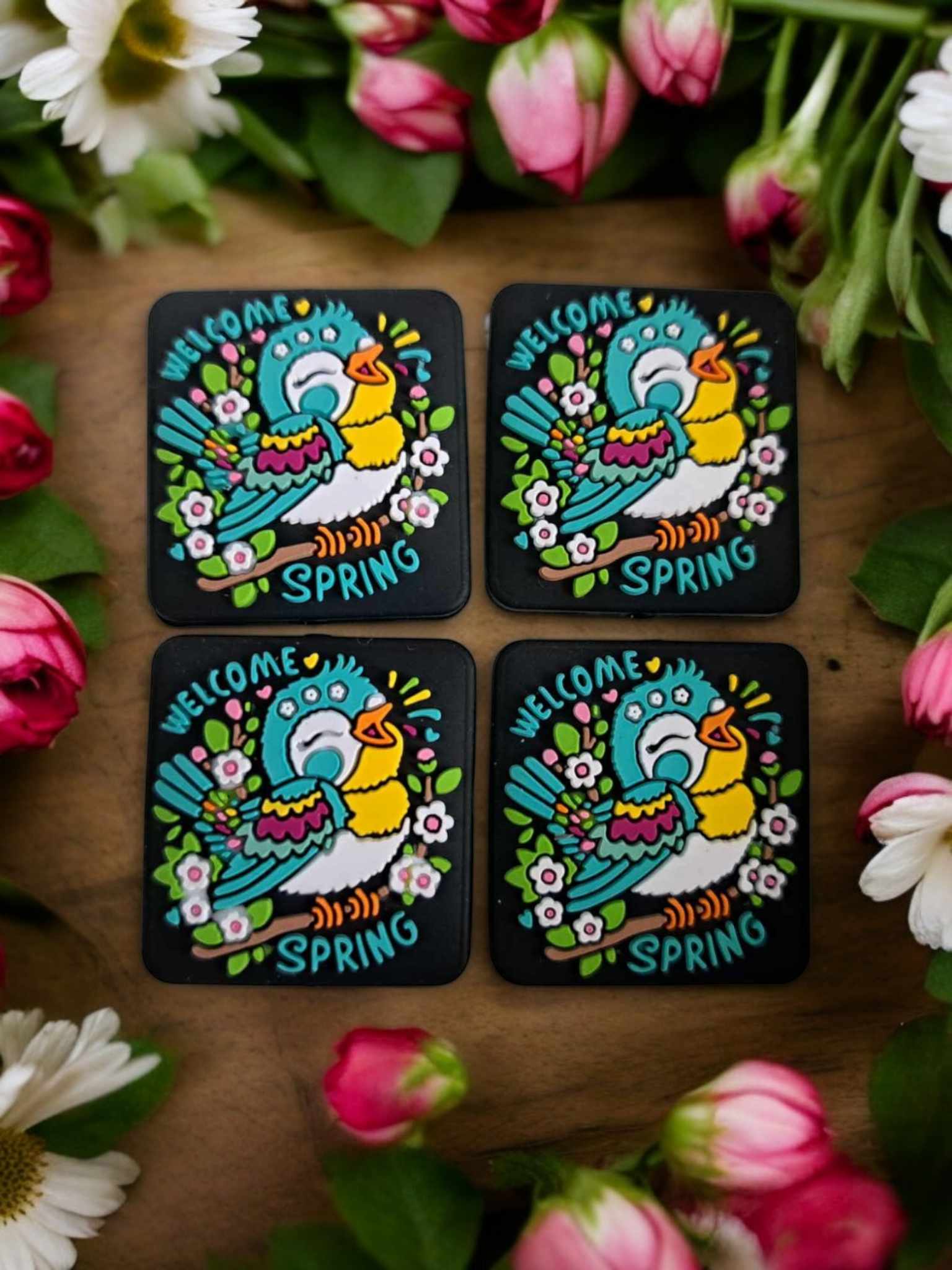 Welcome Spring: Blue Bird on Branch with Flowers Silicone Focal Bead - 0899