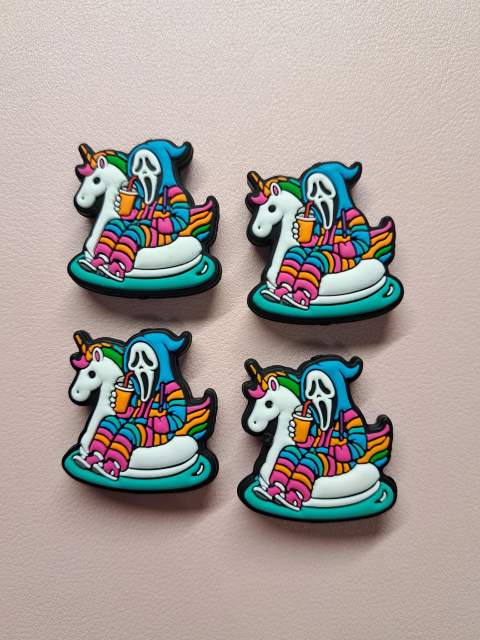 This listing is for: Ghostface in Striped Outfit/Blue Hood: Horror Killer on White Unicorn Floatie with Drink Silicone Focal Bead
