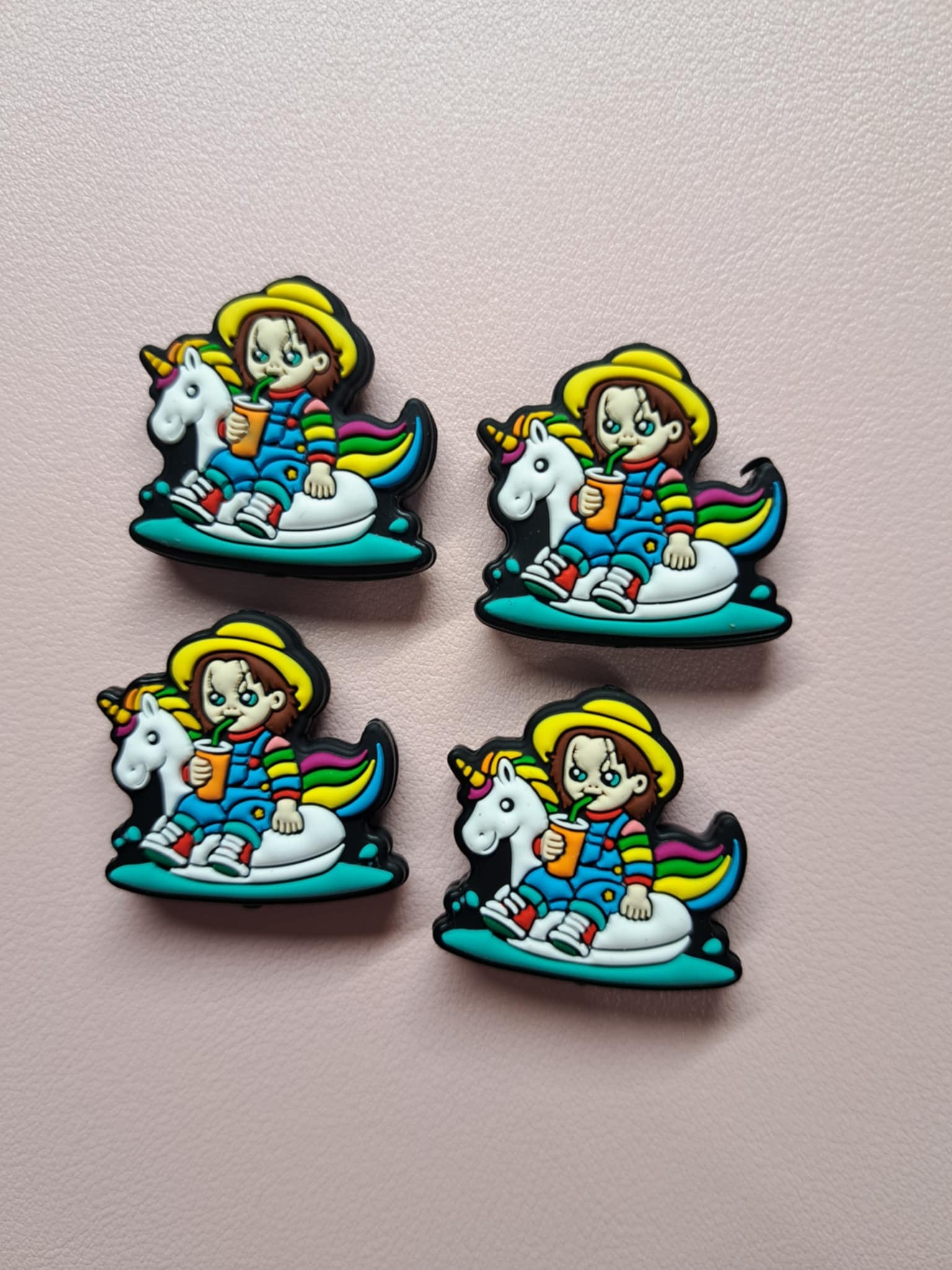 This listing is for: Chucky Horror Killer on White Unicorn Floatie with Drink Silicone Focal Bead