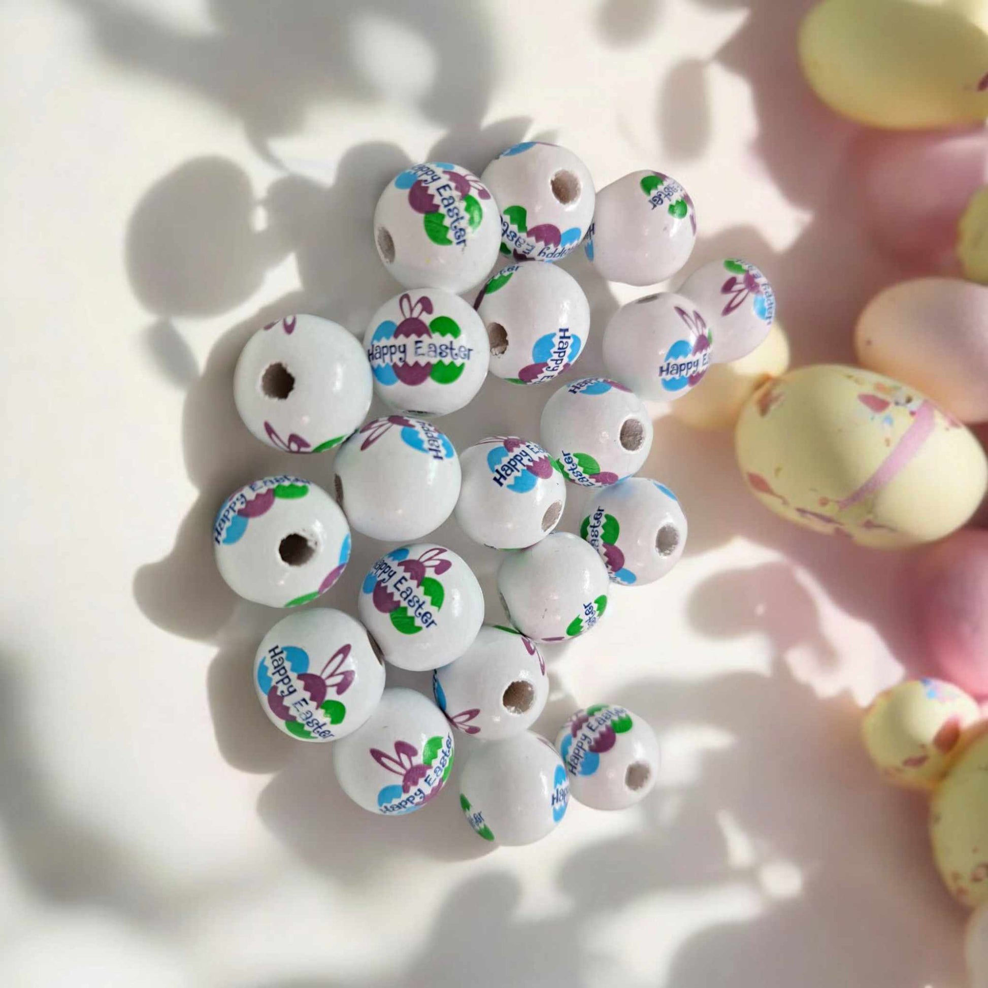 This listing is for: Happy Easter: Easter Eggs with Bunny Ears 16mm Wood Spacer Printed Beads