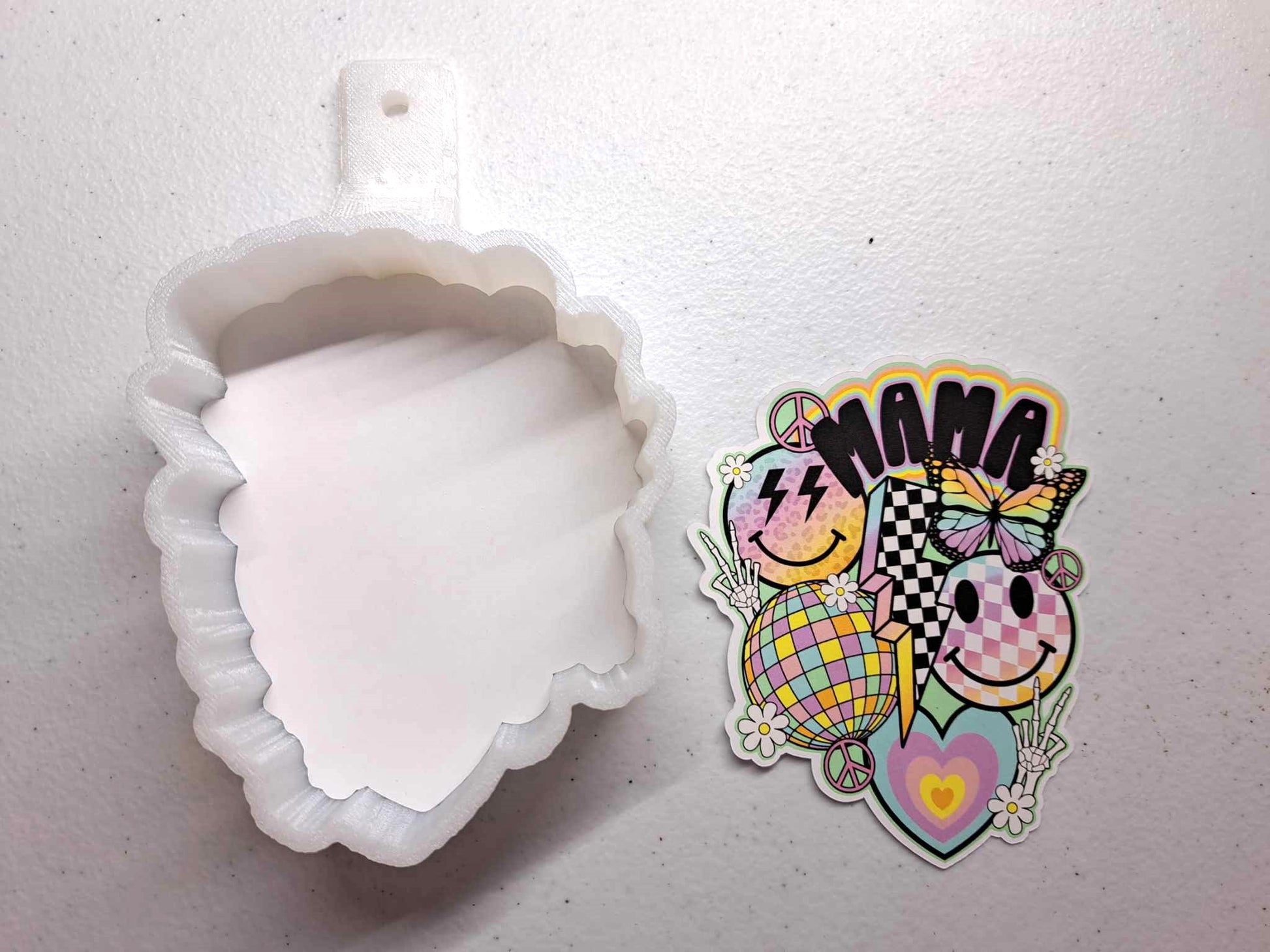 Retro Mama Collage: Disco Ball, Smiley Face, Lightning Bolt, hearts Silicone car freshener mold is 1 inch deep and heat resistant up to 400°. Mold size interior is approximately 4.5 inches tall and 3.7 inches wide.