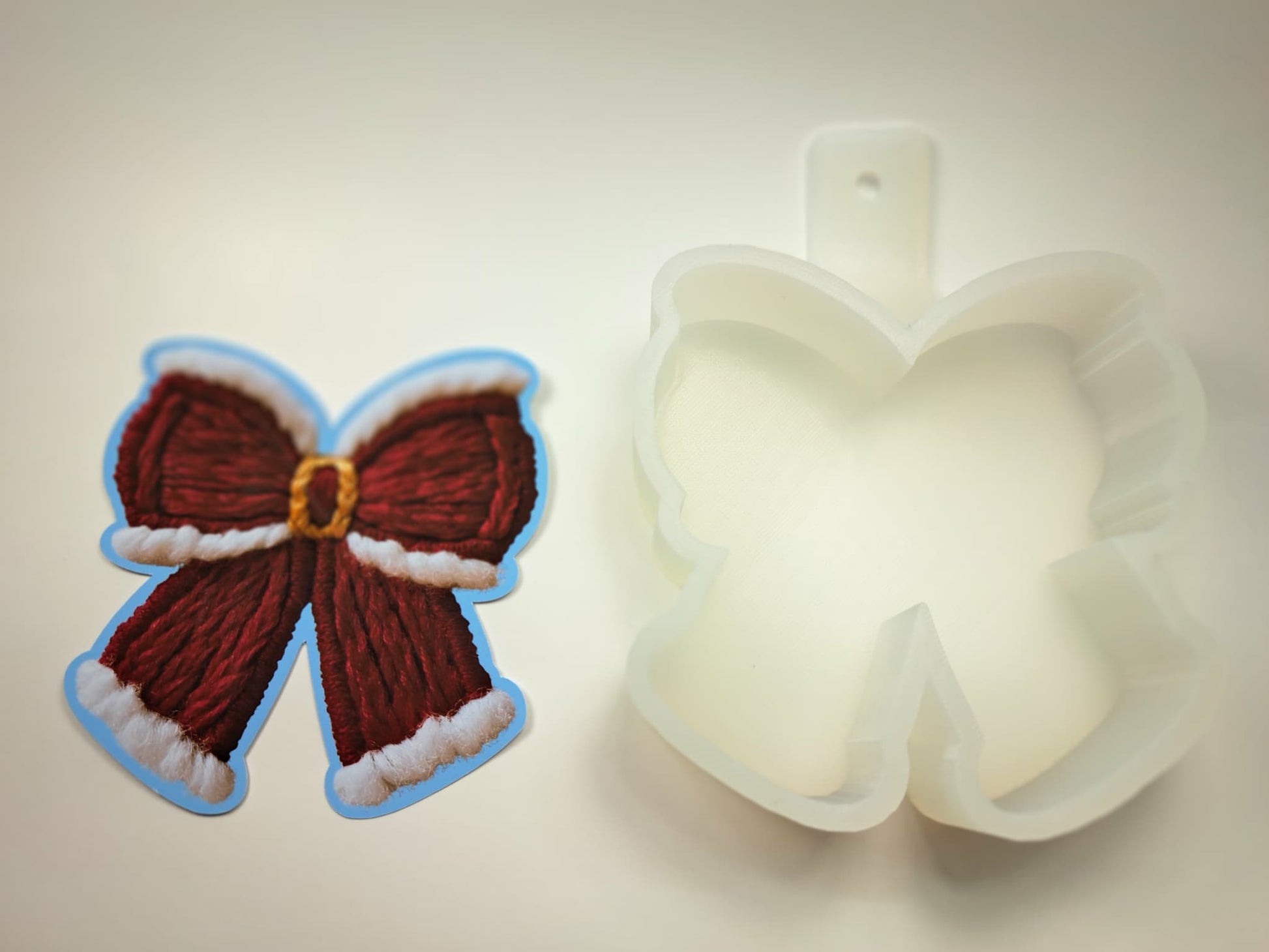 Santa's Belt Coquette Bow cardstock silicone mold is 1 inch deep and heat resistant up to 400°. Mold size interior is approximately 3.95 inches tall and 3.7 inches wide.
