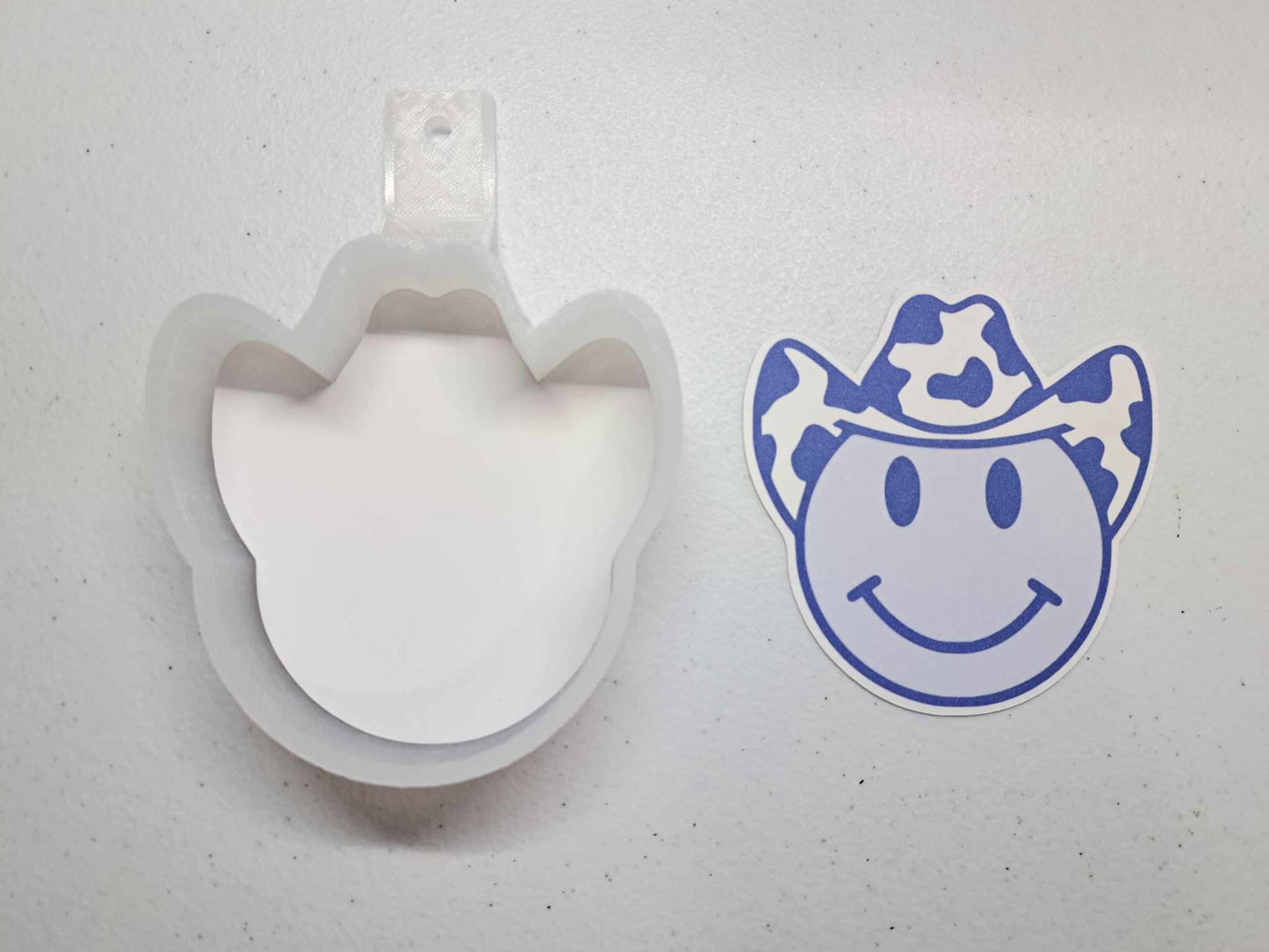 Smiley Face Cowboy Hat with Cow and Star Print/Disco Cowboy Multiple Colors cardstock silicone mold is 1 inch deep and heat resistant up to 400°. Mold size interior is approximately 3.9 inches tall and 3.78 inches wide.