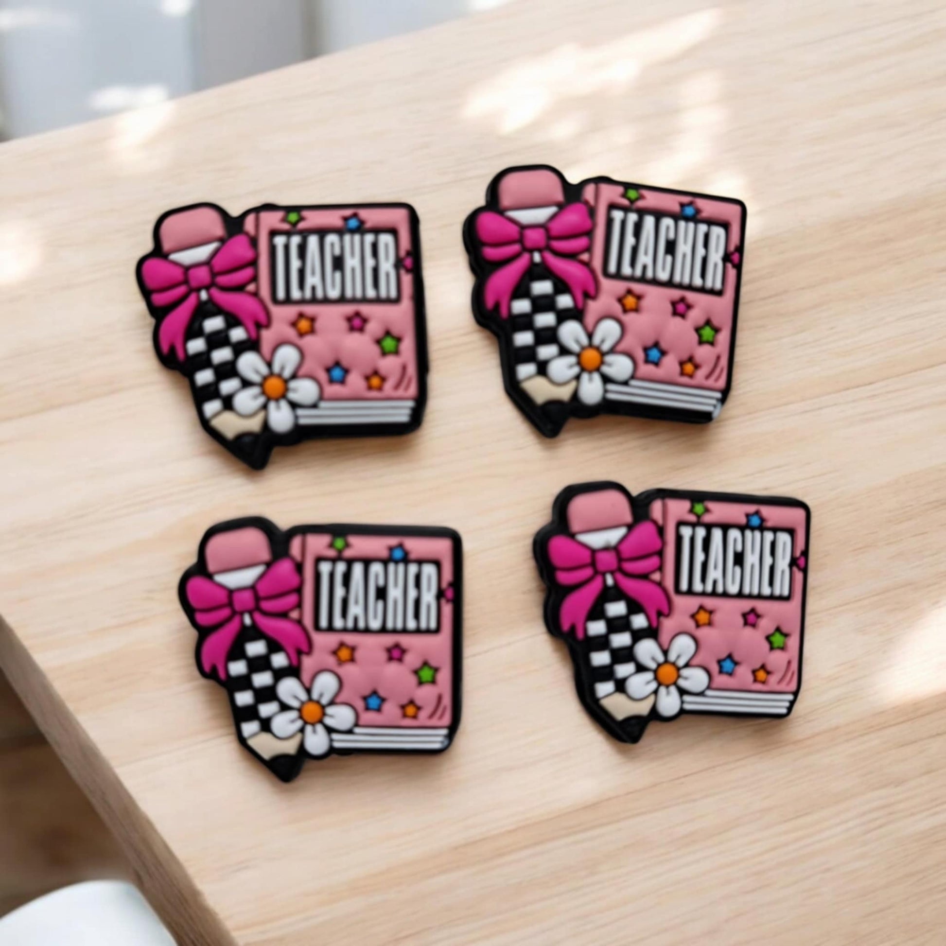 This listing is for: Teacher on Pink Notebook with Checkered Pencil Silicone Focal Bead