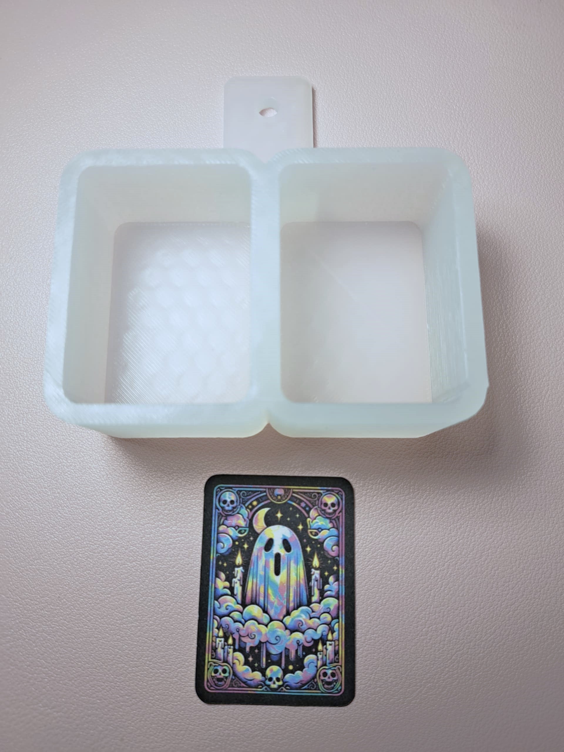 This VENT CLIP: Tarot Cards: Group 2 Two Cavity Small Vent Clip size cardstock silicone mold is 1 inch deep and heat resistant up to 400°. Each of the 2 cavities interior size is approximately 2.0 inches tall and 1.48 inches wide.